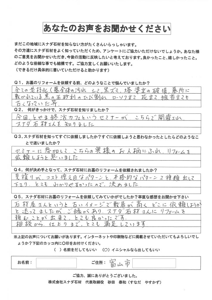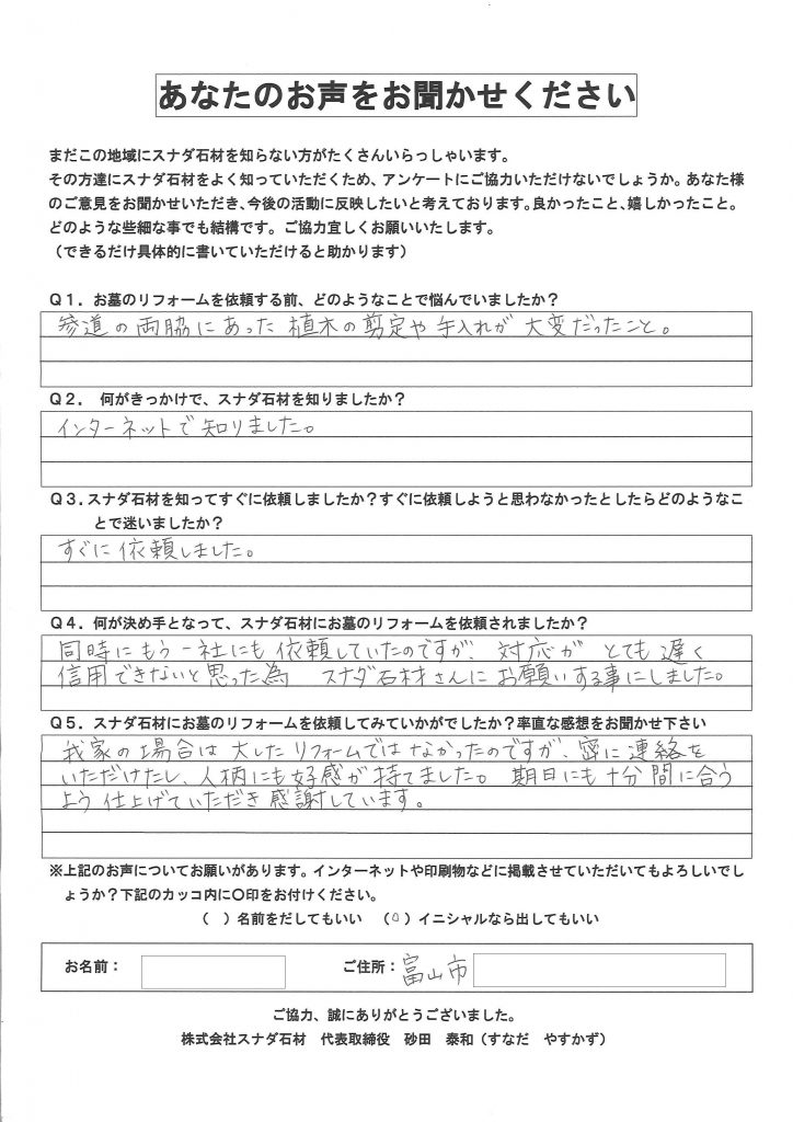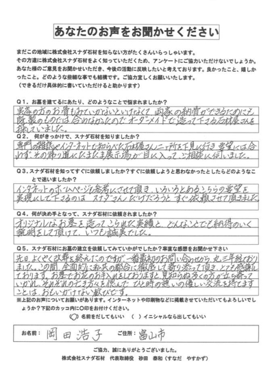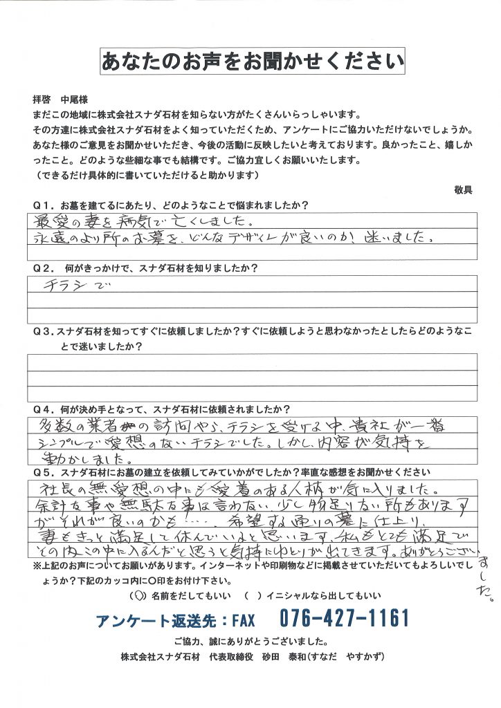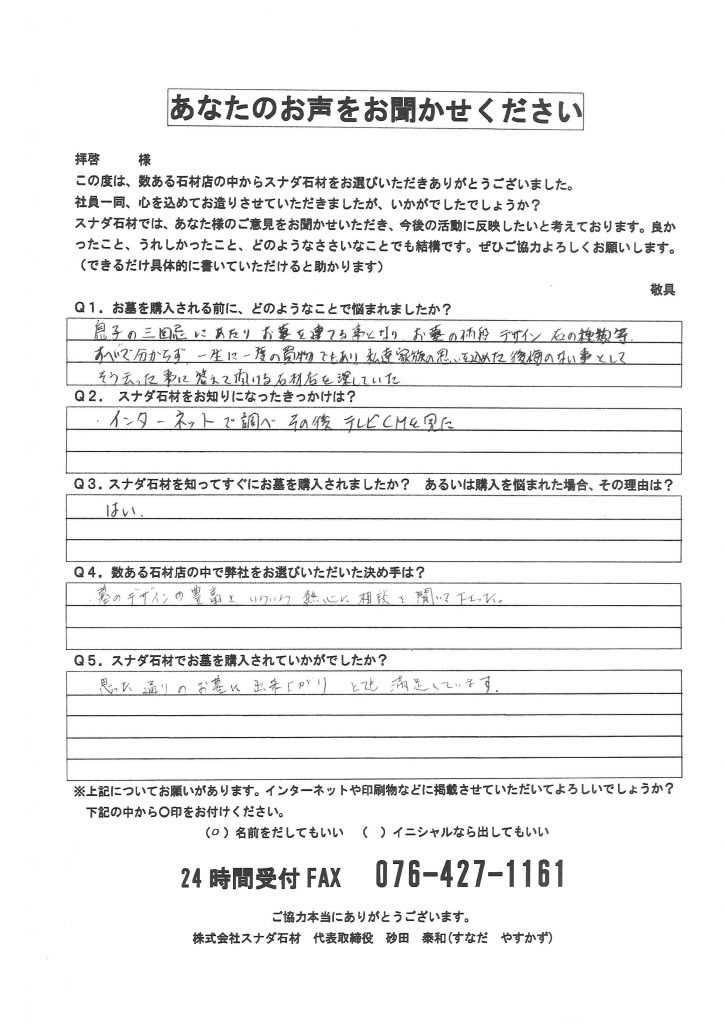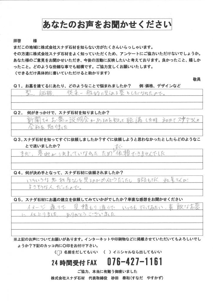 他の石材店が何社も営業に来られ、また近所にも地元の石材店がありましたが、スナダ石材から届いた一枚のチラシの内容に何か心が動かされるものがあり、富山市のスナダ石材を尋ねました。