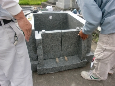 昔は石と石をセメントでつないでいたため、そのセメントが経年劣化していくと、雨や雪の水が沁み込みやすくなるせいで、納骨堂に水がたまっていました。