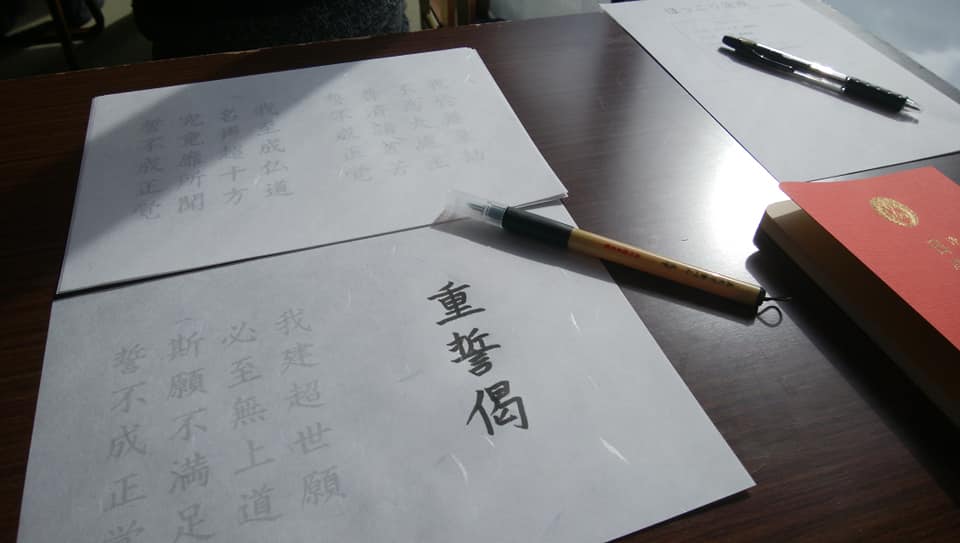 2019年お初の法座で、さらに初めて体験する「和綴じ (わとじ)」、そして一度やってみたいとおもっていた「写経」と、初もの3点セットが揃いました!