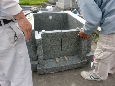 以前のままであれば、納骨は石材店に頼むか、数人がかりで納骨する必要がありましたが、棚もつけて、簡単に納骨できるようになりました。