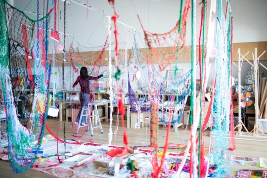 鑑賞者を包みこむように張り巡らされた網には、ボタンや小物、訪れた店の袋、台湾の民芸品、魚津の海岸で拾った石などがぶら下がっています。