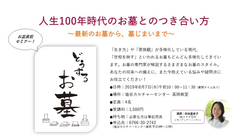 8月の「お墓のセミナー」は、10時からスタートして、11時からは質問タイムをもうけます。誰に相談していいか分からないことなど、お気軽にご質問くださいね。