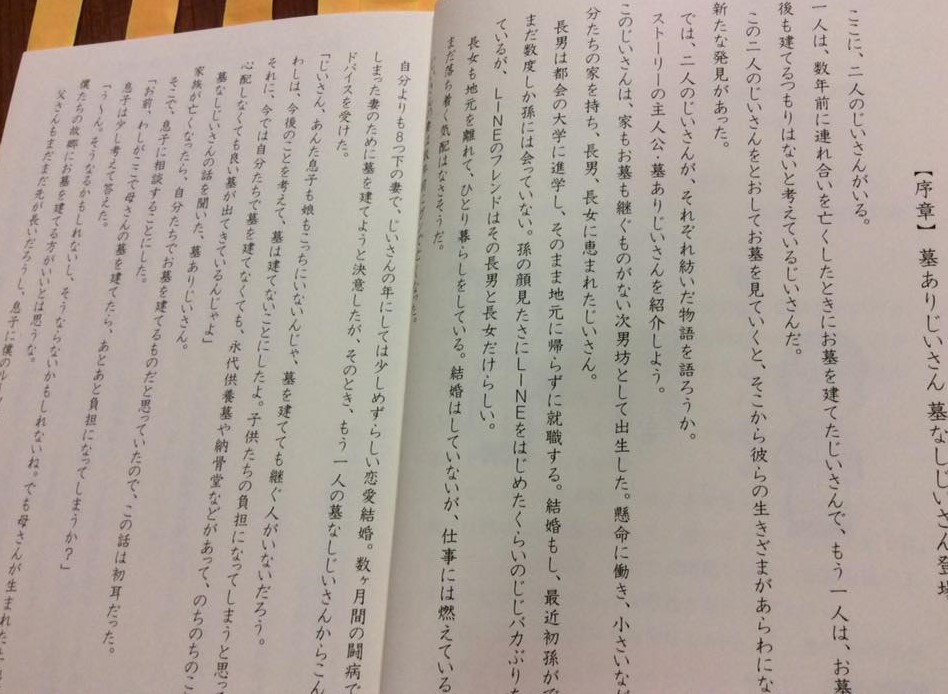 あのベストセラー「金持ち父さん 貧乏父さん」のタイトルを、自分の業界で使ったらどうなるかと考えて創作した「墓ありじいさん 墓なしじいさん」。お墓が必要になった主人公のじいさん(→墓ありじいさん)と、その友人のじいさん(→墓なしじいさん)が、お墓をとおして物語を紡いでいく内容になっています。
