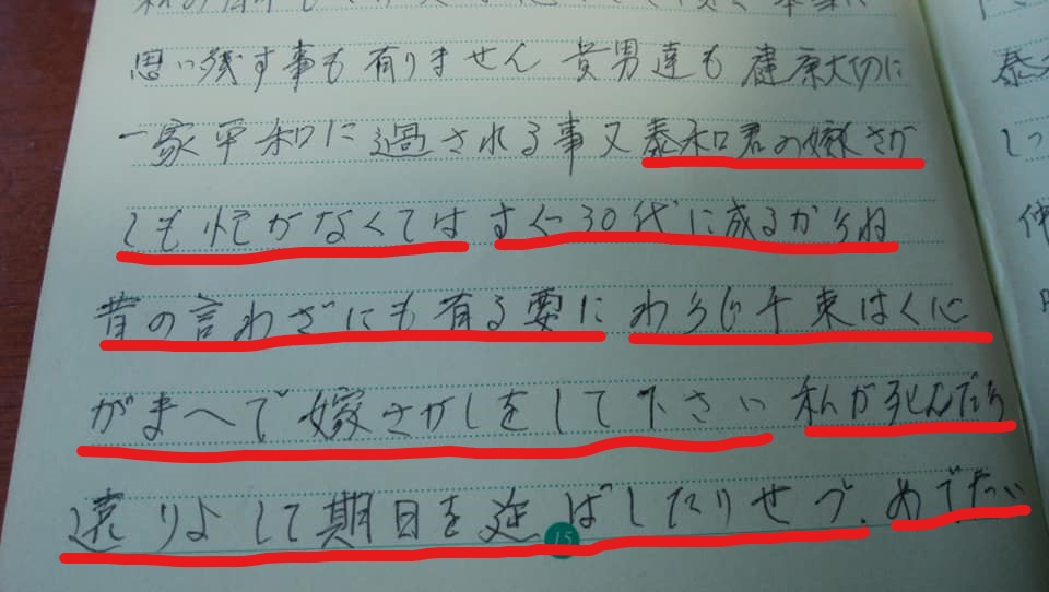 ❝泰和君(夫・現三代目)の嫁さがしも急がなくては。すぐ30代になるからね。昔のことわざにもあるように、わらじ千束履く心がまえで嫁さがしをしてください。私が死んだからといって、遠慮して期日を延ばしたりせず、めでたい事は急がなくては。私は喜んで天上界から見ています。❞