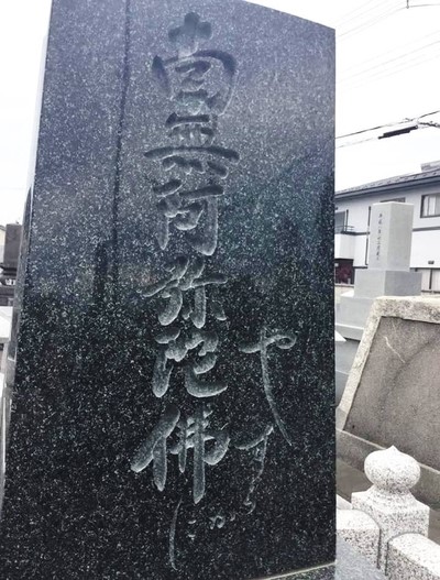 こちらのお墓には「南無阿弥陀仏」に、流れるような「やすらかに」(アート書道家・矢野華風さん作)の文字が彫刻されました。