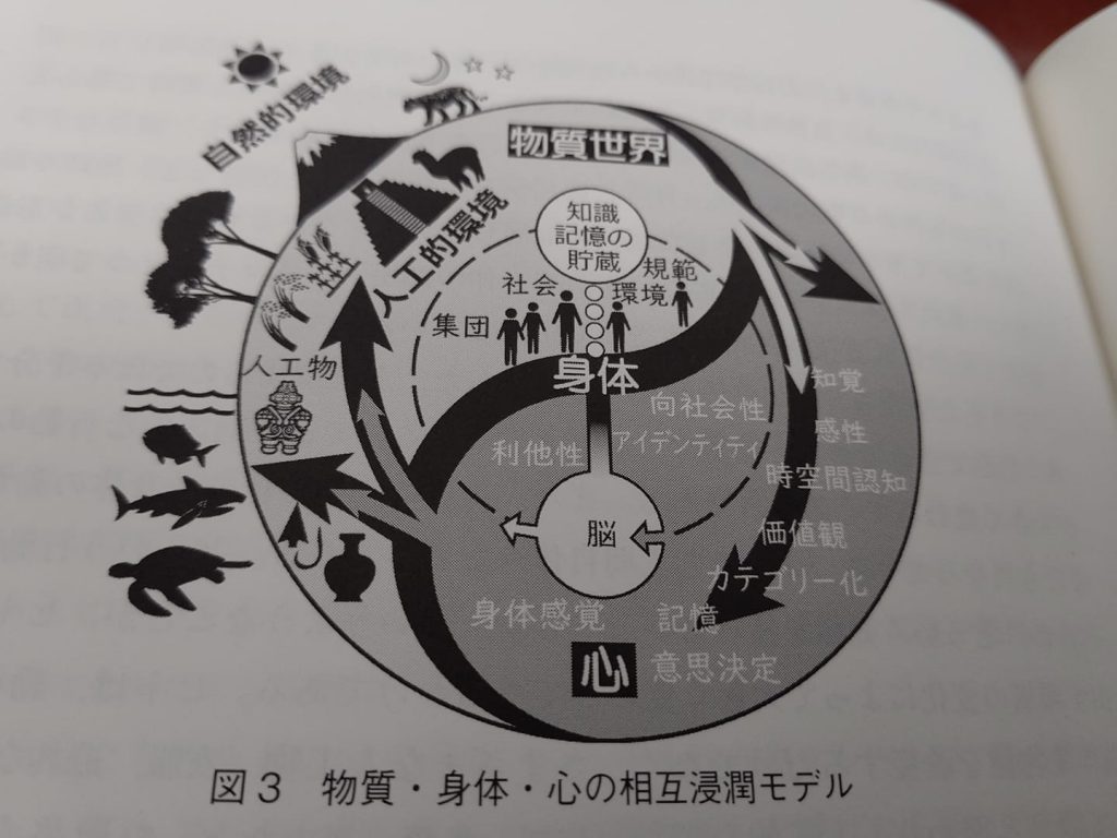 そのようにして物質的な世界を作り出し、その中で生活をすることによって、その世界の見方、感性や、時空間の認識、価値観といったものを学習していく。このサイクルによって、物質的な世界の形成とそこで生きるヒトの心の変化が継続的に進行することになる。知識や記憶、情報というものは、私たちの脳の中だけにあるわけではなく、人工的環境の中にもさまざまな形で存在している。天体の運行に関する知識や、先祖や過去のできごとに関する記憶など、さまざまな情報が環境の中にちりばめられているため、身体を介した物質世界と心のインタラクションの総体を認知活動としてとらえることができる。