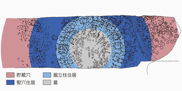 岩手県の西田遺跡では、墓域を中心とした放射線状の構造が明確である。